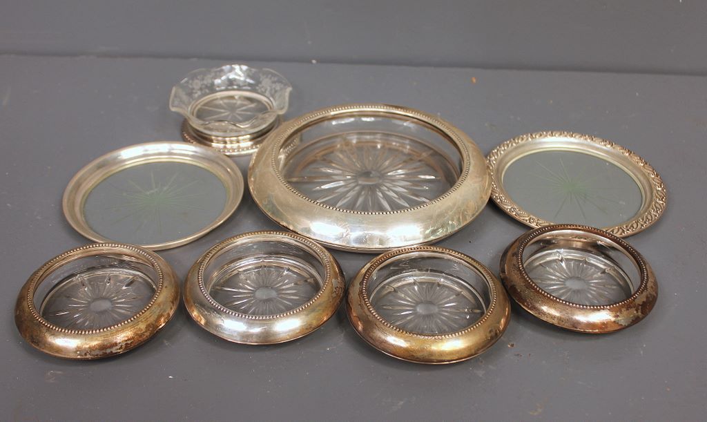 Eight Glass Coasters with Sterling Trim. One: 6 5/8" diameter. Two: 5"diameter, four: 3 3/8" diameter, one with ruffle edge 4" diameter. Eight Glass Coasters with Sterling Trim. One: 6 5/8" diameter. Two: 5"diameter, four: 3 3/8" diameter, one with ruffle edge 4" diameter.