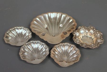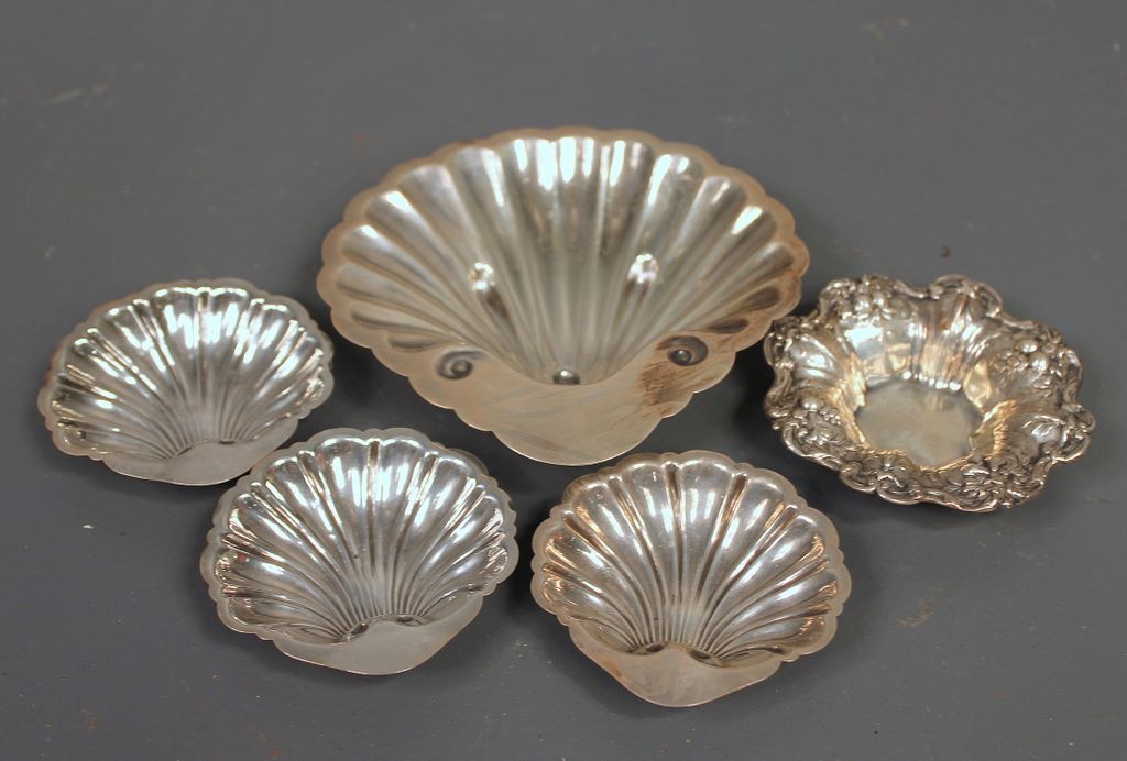 Five Sterling Nut Shell Dishes; two 3" nut dishes in shell shape, one 5" w., s. Kirk and Son shell shaped nut dish, one 3 1/2" Reed and Barton, Francis I nut dish Five Sterling Nut Shell Dishes; two 3" nut dishes in shell shape, one 5" w., s. Kirk and Son shell shaped nut dish, one 3 1/2" Reed and Barton, Francis I nut dish