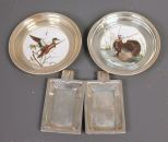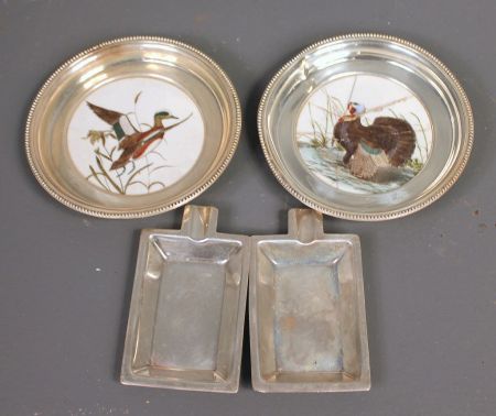 Two Sterling and Porcelain Coasters, Two Sterling Ashtrays; two coasters with porcelain insets 4 1/2" dia., turkey inset is cracked, two ashtrays 3 3/8" l., 2 1/4" w. Two Sterling and Porcelain Coasters, Two Sterling Ashtrays; two coasters with porcelain insets 4 1/2" dia., turkey inset is cracked, two ashtrays 3 3/8" l., 2 1/4" w.