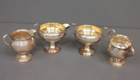 Four Pieces of Sterling, including; one pair sugar and creamer 4" h., one pair (with bent base on sugar 4" h.) Four Pieces of Sterling, including; one pair sugar and creamer 4" h., one pair (with bent base on sugar 4" h.)