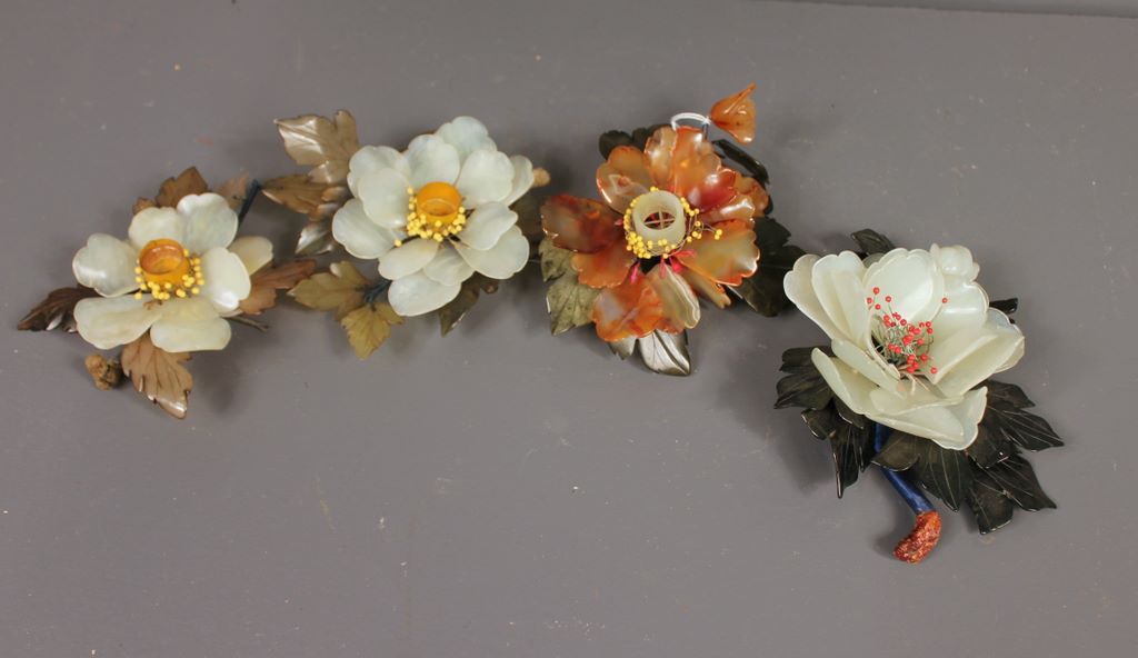 Four Jade Flowers, three have candle holders; 8" w., 2" h. Four Jade Flowers, three have candle holders; 8" w., 2" h.