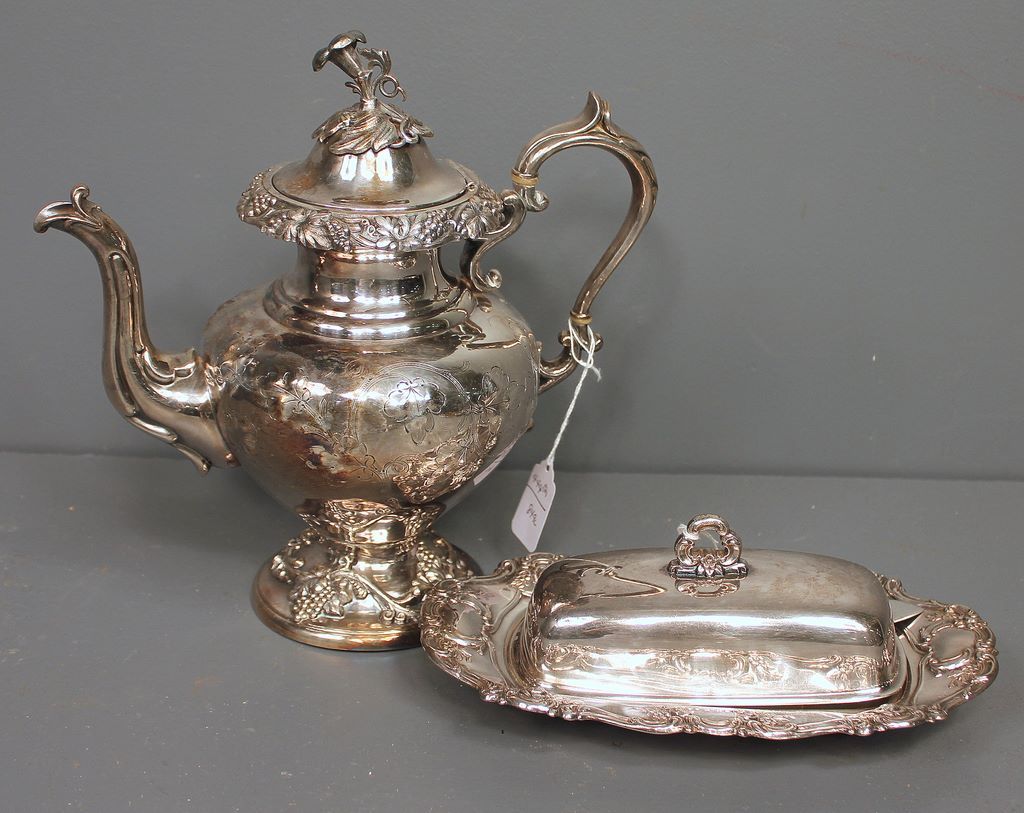 Two Pieces of Silverplate; Towle silverplate butter dish with glass liner 9" l., ornate floral silverplate teapot 11" h. Two Pieces of Silverplate; Towle silverplate butter dish with glass liner 9" l., ornate floral silverplate teapot 11" h.