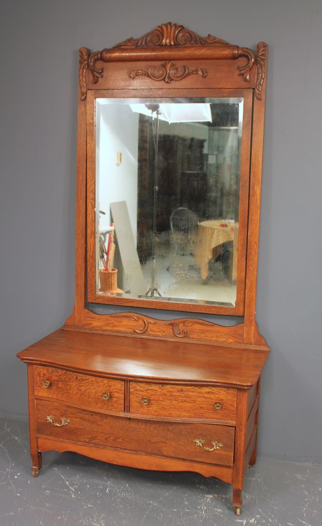 20th century Oak Dresser, with carving on beveled mirror, low two drawers over one drawer, original casters; 85" h., 44" w., 21" d. 20th century Oak Dresser, with carving on beveled mirror, low two drawers over one drawer, original casters; 85" h., 44" w., 21" d.