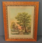Vintage Print of Country Road and Trees, signed Fisher, in bird's eye maple frame; 18" x 14 1/2" Vintage Print of Country Road and Trees, signed Fisher, in bird's eye maple frame; 18" x 14 1/2"