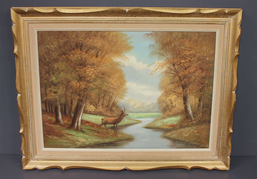 Oil Painting of Deer in Vintage Frame, signed lower left; 25 1/2" h., 34" w. Oil Painting of Deer in Vintage Frame, signed lower left; 25 1/2" h., 34" w.