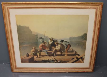 Print of "Jolly Flat Boat Men" , copy from original painting by G.C. Bingham; 32" h., 39" w. Print of "Jolly Flat Boat Men" , copy from original painting by G.C. Bingham; 32" h., 39" w.
