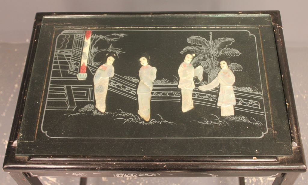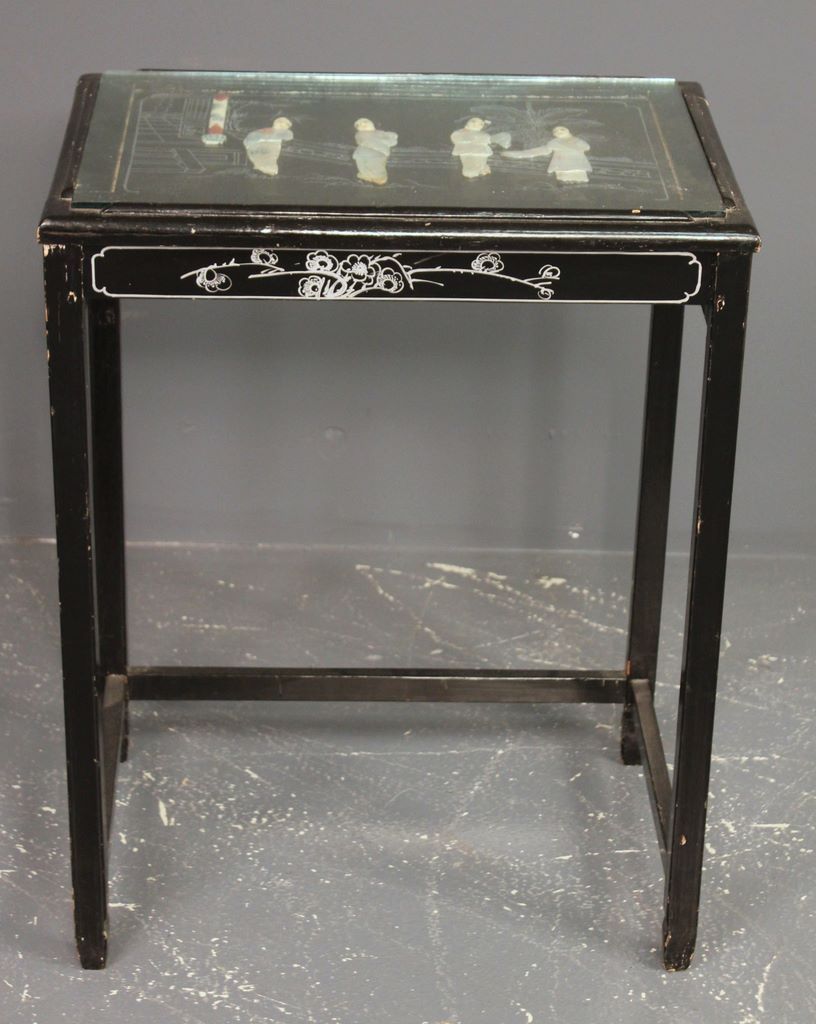 Black Lacquer Table, 20th century black lacquer end table with painted ladies and oriental motif; 25" h., 21" w., 14" d. Black Lacquer Table, 20th century black lacquer end table with painted ladies and oriental motif; 25" h., 21" w., 14" d.
