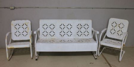 Retro style white iron glidder 58 1/2"l., 22"d, 32 h. along with two matching chairs 22 1/2" w., 24"d., 34 1/2"h. Retro style white iron glidder 58 1/2"l., 22"d, 32 h. along with two matching chairs 22 1/2" w., 24"d., 34 1/2"h.