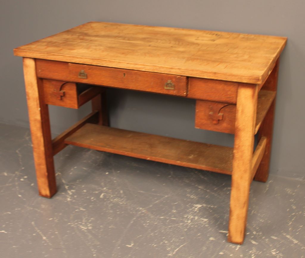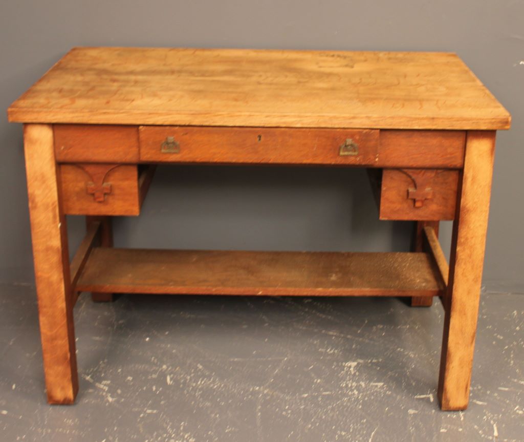 Early 20th century oak desk in mission style with center drawer, two side drawers, bottom shelf; 30" h., 42" w., 26" d. Early 20th century oak desk in mission style with center drawer, two side drawers, bottom shelf; 30" h., 42" w., 26" d.