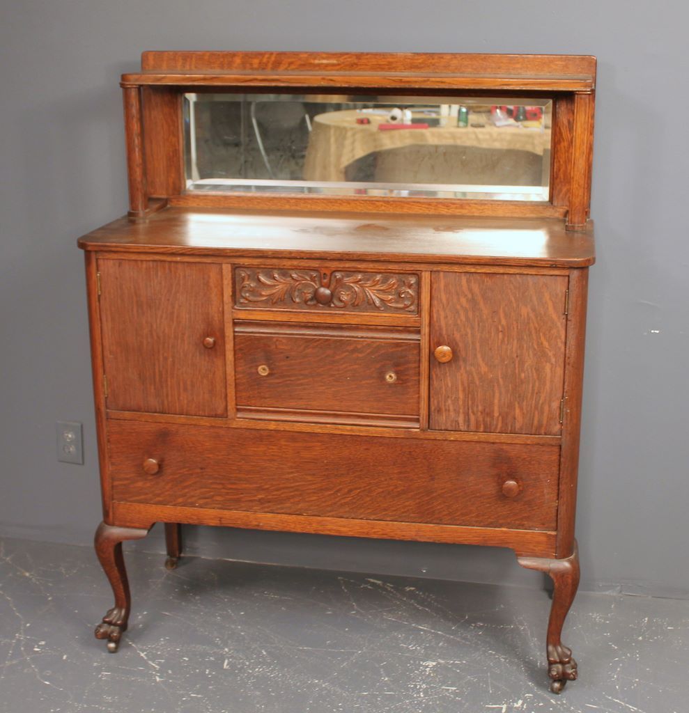 Small 20th century oak server, top having beveled mirror, lower section has center carved drawer over drawer, flanked by two doors, over long drawer, supported by claw feet; 57" h., 44" w., 19" d. Small 20th century oak server, top having beveled mirror, lower section has center carved drawer over drawer, flanked by two doors, over long drawer, supported by claw feet; 57" h., 44" w., 19" d.