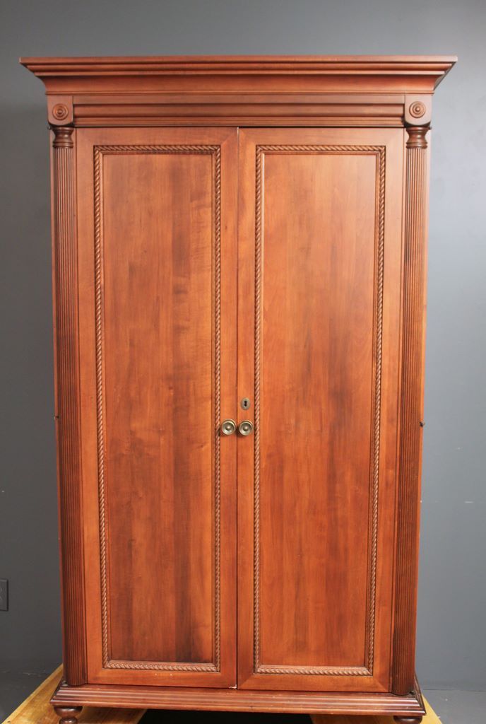 Contemporary Mahogany Wardrobe, with pilasters, cornice, two doors on bun feet; 80" h., 42" w., 22" d. Contemporary Mahogany Wardrobe, with pilasters, cornice, two doors on bun feet; 80" h., 42" w., 22" d.