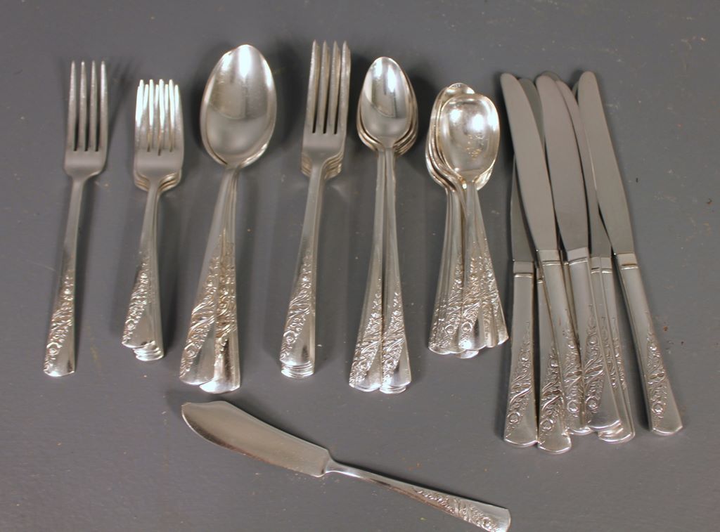 Stainless Steel Flatware, consisting of eight knives, eight dinner forks, six salad forks, eight ice teaspoons, eight teaspoons, three serving spoons, berry spoon, butter knife by Harmony Stainless Steel Flatware, consisting of eight knives, eight dinner forks, six salad forks, eight ice teaspoons, eight teaspoons, three serving spoons, berry spoon, butter knife by Harmony