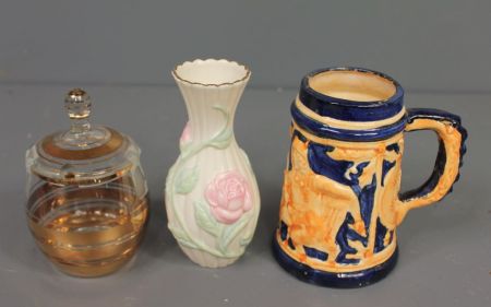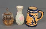 Group of Vintage Pieces, made in Japan ceramic mug 6" h., 3 1/2" dia., Lenox bud vase 5 5/8" h., glass mustard jar 5 1/2" h. Group of Vintage Pieces, made in Japan ceramic mug 6" h., 3 1/2" dia., Lenox bud vase 5 5/8" h., glass mustard jar 5 1/2" h.