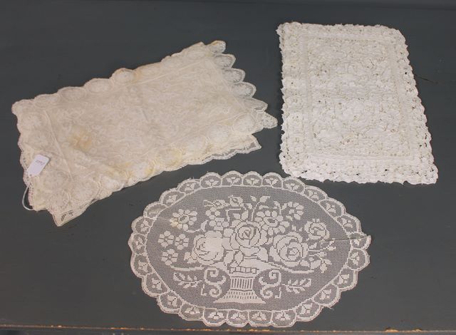 Group of Lace Tablemats; five vintage white lace tablemats (10" x 16"), eleven vintage lace tablemats, two with butterfly design (16 1/2" x 9"), one oval (14 1/2" x 10") Group of Lace Tablemats; five vintage white lace tablemats (10" x 16"), eleven vintage lace tablemats, two with butterfly design (16 1/2" x 9"), one oval (14 1/2" x 10")