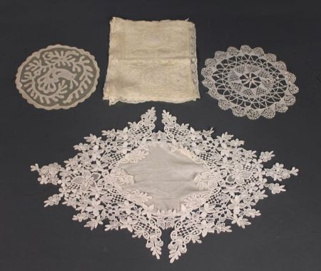Group of Handmade Lace Doilies; Round lace and linen doily of deer 7" dia., one round hand crochet doily 8" dia., six hand made linen and lace, embroidered doilies (9" x 7"), one beautiful linen and hand made doily (19" x 12" ) Group of Handmade Lace Doilies; Round lace and linen doily of deer 7" dia., one round hand crochet doily 8" dia., six hand made linen and lace, embroidered doilies (9" x 7"), one beautiful linen and hand made doily (19" x 12" )