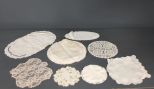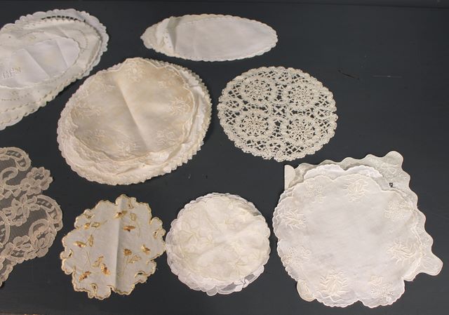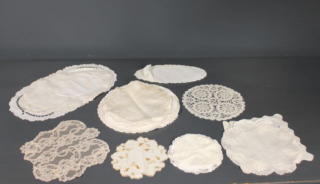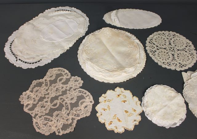 Group of Vintage Tablemats and Doilies; including eleven oval whitework embroidered tablemats in various sizes (16"-7"), ten 11" dia. Whitework, six 9 1/2" dia., seven 9 1/2" linen, lace and embroidery doilies, one square, ten 5 1/2" dia. Doilies Group of Vintage Tablemats and Doilies; including eleven oval whitework embroidered tablemats in various sizes (16"-7"), ten 11" dia. Whitework, six 9 1/2" dia., seven 9 1/2" linen, lace and embroidery doilies, one square, ten 5 1/2" dia. Doilies