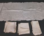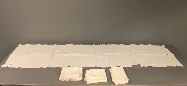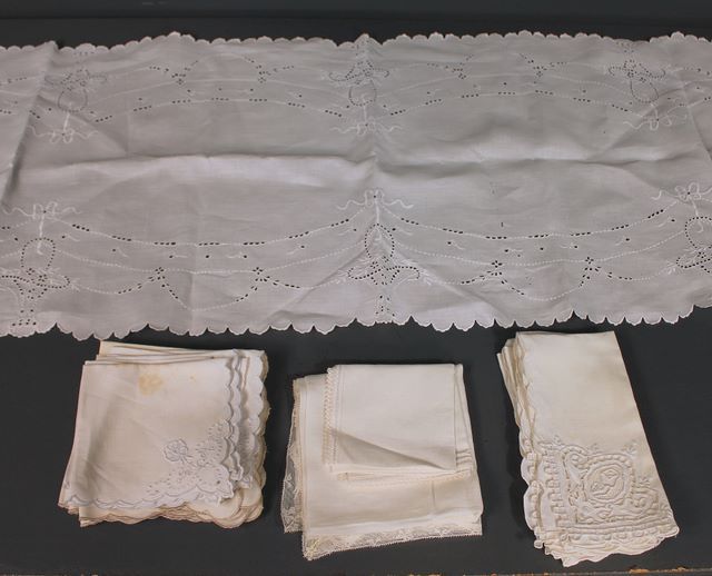 Vintage Runner and Napkins; vintage whitework embroidered table runner (64" l. 18 1/2" d.), thirteen linen and embroidered napkins, two square linen and lace doilies, set of four linen and embroidered corner napkins. Vintage Runner and Napkins; vintage whitework embroidered table runner (64" l. 18 1/2" d.), thirteen linen and embroidered napkins, two square linen and lace doilies, set of four linen and embroidered corner napkins.