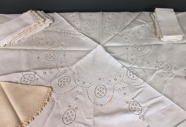 Vintage Embroidered Doilies and Napkins; various linen and embroidered square doilies, 18" round doily, 42" dia. Whitework round tablecloth, twenty linen and lace napkins Vintage Embroidered Doilies and Napkins; various linen and embroidered square doilies, 18" round doily, 42" dia. Whitework round tablecloth, twenty linen and lace napkins