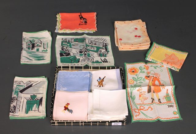 Vintage Cocktail Napkins; set of five with hand stitching of black men, set of nine white, set of three pink with hand stitched rooster, set of eight blue with white stitched flowers, set of four in various colors with hand stitched man at light post, set of six apricot and white with hand stitched cherries. Set of five with New Orleans scenes, three signed Tony Sarg Cocktail napkins. Vintage Cocktail Napkins; set of five with hand stitching of black men, set of nine white, set of three pink with hand stitched rooster, set of eight blue with white stitched flowers, set of four in various colors with hand stitched man at light post, set of six apricot and white with hand stitched cherries. Set of five with New Orleans scenes, three signed Tony Sarg Cocktail napkins.