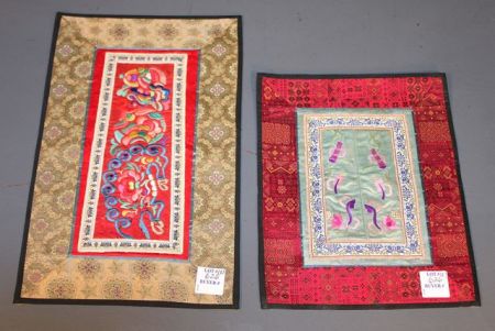 Two Embroidered Panels, one colorful hand stitched flowers on celadon silk, framed by braids; 8" w., 10" h.; one colorful embroidery work on Chinese red silk, framed by two braids; 7 3/8" w., 13" h. Two Embroidered Panels, one colorful hand stitched flowers on celadon silk, framed by braids; 8" w., 10" h.; one colorful embroidery work on Chinese red silk, framed by two braids; 7 3/8" w., 13" h.