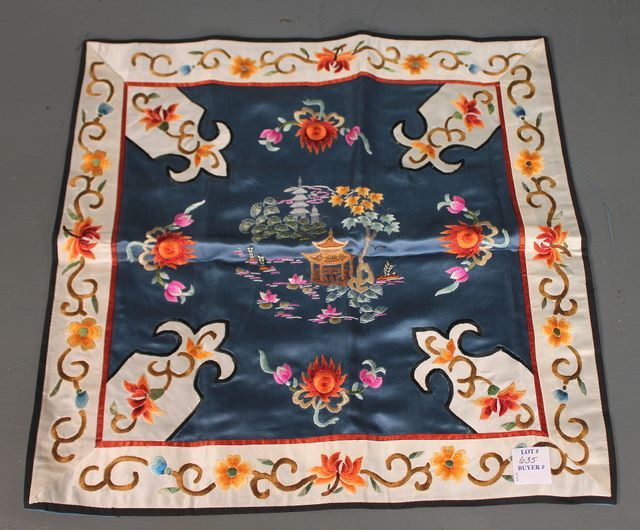 Chinese Bright Blue Silk Embroidered Pillow Cover with hand stitched scene of oriental garden and flowers, framed in white silk with stitched flowers; 15" w., 15 1/2" h. Chinese Bright Blue Silk Embroidered Pillow Cover with hand stitched scene of oriental garden and flowers, framed in white silk with stitched flowers; 15" w., 15 1/2" h.