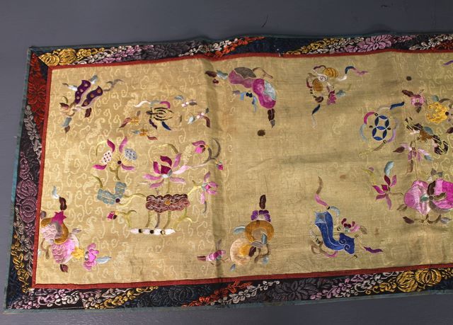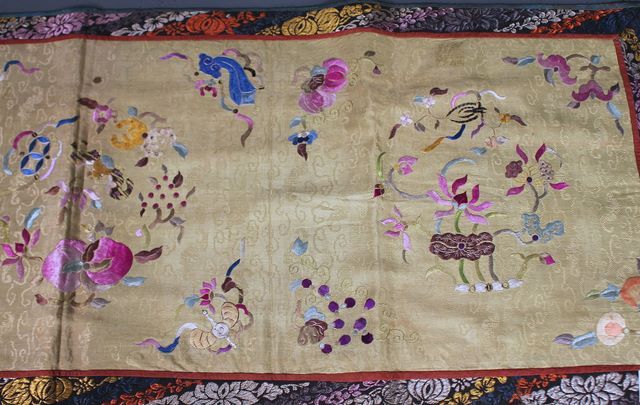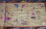 Chinese Silk Panel in Vibrant Green with hand stitched flowers in bright blue and purples, framed by braid; 39 1/4" w., 14" h. Chinese Silk Panel in Vibrant Green with hand stitched flowers in bright blue and purples, framed by braid; 39 1/4" w., 14" h.