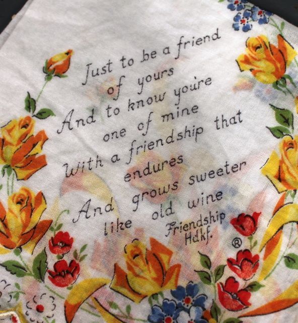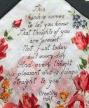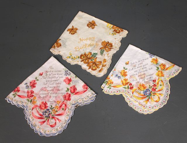 Set of Three Vintage Handkerchiefs, one being scallop edge, greeting words, one Happy Birthdays, one Friendship Set of Three Vintage Handkerchiefs, one being scallop edge, greeting words, one Happy Birthdays, one Friendship