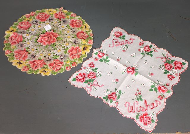 Two Vintage Handkerchiefs, one beautiful pink roses "Wishes", one round pink roses, scallop edge Two Vintage Handkerchiefs, one beautiful pink roses "Wishes", one round pink roses, scallop edge