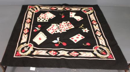Made in China Needlepoint Tablecloth, black ground with cherries, flowers and cards hand stitched, red cloth backing 35" w., 34" h. Made in China Needlepoint Tablecloth, black ground with cherries, flowers and cards hand stitched, red cloth backing 35" w., 34" h.