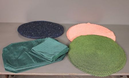 group of tablemats that include a set of eight crocheted (green, round 18") set of four pink crocheted 18" round, set of twelve matching napkins, green moire 18" w., 12" h. Set of six blue sparkle ovals 18" w., 13" h. group of tablemats that include a set of eight crocheted (green, round 18") set of four pink crocheted 18" round, set of twelve matching napkins, green moire 18" w., 12" h. Set of six blue sparkle ovals 18" w., 13" h.