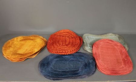 Group of Various Tablemats, group includes; manila hemp tablemats, six blue 19" ovals, set of fifteen 19" orange ovals, three 19" gold ovals, four gold 15 1/2" round, eight 18" aqua, five 18 1/2" oval deep orange Group of Various Tablemats, group includes; manila hemp tablemats, six blue 19" ovals, set of fifteen 19" orange ovals, three 19" gold ovals, four gold 15 1/2" round, eight 18" aqua, five 18 1/2" oval deep orange