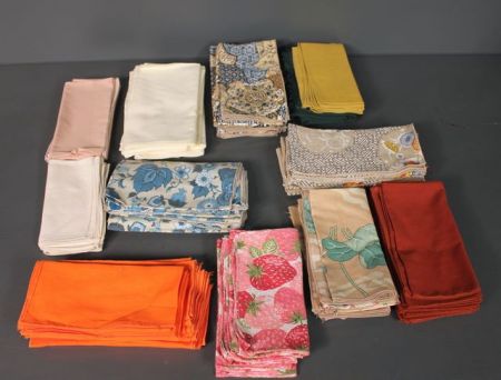 Group of Cotton Napkins; six strawberries, three gold, four green, twelve bright orange, five light brown trimmed in white, four ecru, seven burnt orange, eight oriental design in brown, eight brown and green floral, eight oriental motif in brown and blue, eight blues and white florals, ten soft yellow. Group of Cotton Napkins; six strawberries, three gold, four green, twelve bright orange, five light brown trimmed in white, four ecru, seven burnt orange, eight oriental design in brown, eight brown and green floral, eight oriental motif in brown and blue, eight blues and white florals, ten soft yellow.