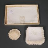 Set of six vintage hand embroidery linen 8" cocktail napkins (in original box) eight matching linen and lace embroidery cocktail napkins 7" square and one crochet coaster Set of six vintage hand embroidery linen 8" cocktail napkins (in original box) eight matching linen and lace embroidery cocktail napkins 7" square and one crochet coaster