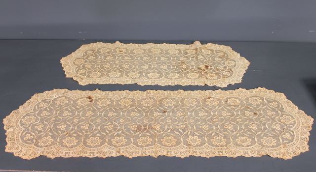 Two Quality Lace Pieces, one being a 31" w., 12" h. doily, and one being the same pattern 39 1/2" w., 12" h. doily. These are exceptional pieces Two Quality Lace Pieces, one being a 31" w., 12" h. doily, and one being the same pattern 39 1/2" w., 12" h. doily. These are exceptional pieces