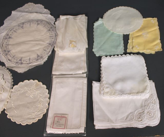Group of Miscellaneous Linen Cutwork and Embroidery Napkins and Tablemats, group includes' color sets of four cocktail napkins, two sets of cocktail napkins with monograms, set of ten white linen cocktail napkins embroidered with shield and wings, set of six Battenburg cocktail napkins, and other embroidery doilies Group of Miscellaneous Linen Cutwork and Embroidery Napkins and Tablemats, group includes' color sets of four cocktail napkins, two sets of cocktail napkins with monograms, set of ten white linen cocktail napkins embroidered with shield and wings, set of six Battenburg cocktail napkins, and other embroidery doilies