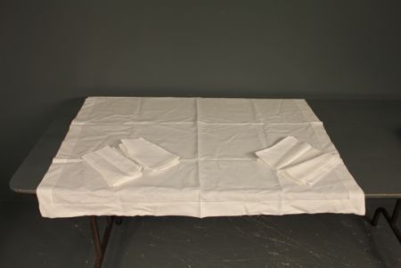 White Linen Tablecloth, 44" w., 43" l., along with eight white linen napkins. White Linen Tablecloth, 44" w., 43" l., along with eight white linen napkins.