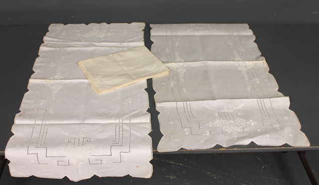 Three Linen Dresser Top Doilies, two matching linen and embroidery dresser top doilies 17" w., 33" l., one linen and embroidery, lace trim dresser top doily 16" w., 42' l. Three Linen Dresser Top Doilies, two matching linen and embroidery dresser top doilies 17" w., 33" l., one linen and embroidery, lace trim dresser top doily 16" w., 42' l.