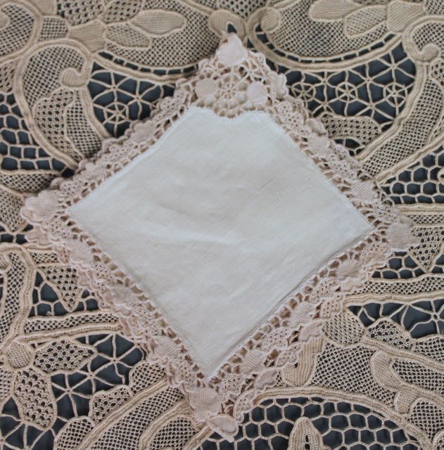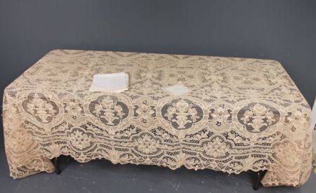 Exquisite Beige Handmade Lace Tablecloth, made with beige cotton thread, outstanding lace inserts, open cutwork, believe to be from Madeira 63" w., 134" l., also with this lot are six ecru line (embroidery corner) napkins and three coasters Exquisite Beige Handmade Lace Tablecloth, made with beige cotton thread, outstanding lace inserts, open cutwork, believe to be from Madeira 63" w., 134" l., also with this lot are six ecru line (embroidery corner) napkins and three coasters