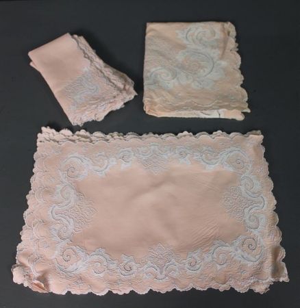 Set of eight pink linen tablemats with embroidery and stitched edges 16" w., 11" h. along with eight matching napkins and a dresser top doily 38" w., 96" h. Set of eight pink linen tablemats with embroidery and stitched edges 16" w., 11" h. along with eight matching napkins and a dresser top doily 38" w., 96" h.