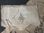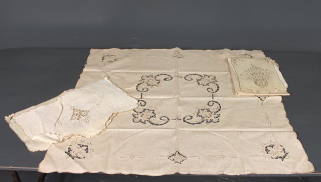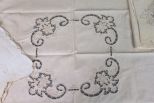 695 Group of Beige Linen and Ecru Embroidery Doilies and Tablecloth Description