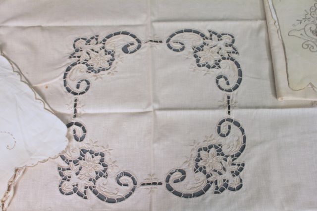 Group of beige linen and ecru embroidery doilies, one tablecloth 32" x 30", one dresser top doily 43" x 17", four doilies 7" x 11", two doilies 16 1/2" x 9 1/2" Group of beige linen and ecru embroidery doilies, one tablecloth 32" x 30", one dresser top doily 43" x 17", four doilies 7" x 11", two doilies 16 1/2" x 9 1/2"