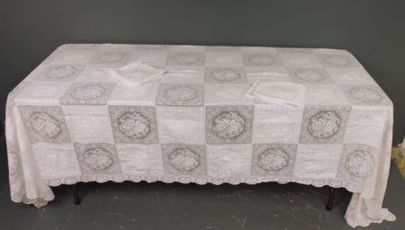 SHOWSTOPPER! This is an extremely fine tablecloth. White linen and lace alternating squares, embroidered flowers on linen squares framed by lace border 63" x 110", also set of twelve linen embroidery lace napkins. SHOWSTOPPER! This is an extremely fine tablecloth. White linen and lace alternating squares, embroidered flowers on linen squares framed by lace border 63" x 110", also set of twelve linen embroidery lace napkins.