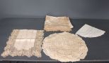 Taupe linen tablecloth with embroidery and lace, wide lace border 48" square, linen and crochet doily 34" l., 14" w., round 22" dia. Linen and lace doily with cupids in the center, set of six 15 1/2" round lace doilies. Taupe linen tablecloth with embroidery and lace, wide lace border 48" square, linen and crochet doily 34" l., 14" w., round 22" dia. Linen and lace doily with cupids in the center, set of six 15 1/2" round lace doilies.