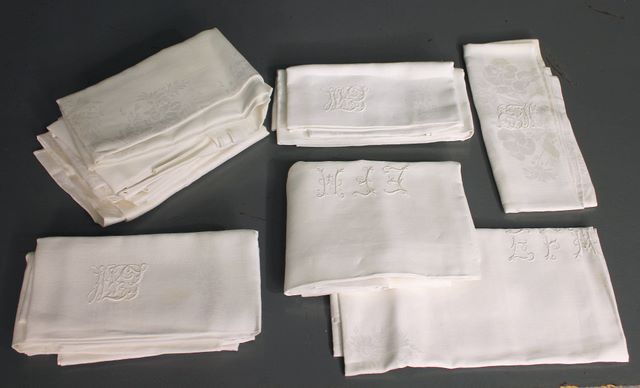 Approximately twelve Irish linen damask table pieces (cloth, mats) all monogrammed. Approximately twelve Irish linen damask table pieces (cloth, mats) all monogrammed.