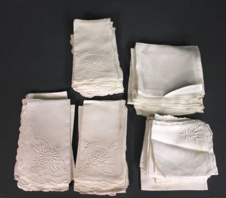 Nineteen linen with embroidery corner napkins (some stains) set of twelve linen napkins, sixteen various linen napkins Nineteen linen with embroidery corner napkins (some stains) set of twelve linen napkins, sixteen various linen napkins