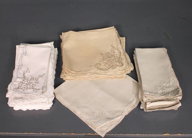 Approximately twenty five (25) linen and embroidery napkins, several sets, some with stains Approximately twenty five (25) linen and embroidery napkins, several sets, some with stains