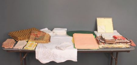 Box lot of linens, approximately four organza or linen tablecloths in various sizes (stains) embroidery and lace napkins and tablemats. This is a good lot but most linens are stained. Box lot of linens, approximately four organza or linen tablecloths in various sizes (stains) embroidery and lace napkins and tablemats. This is a good lot but most linens are stained.