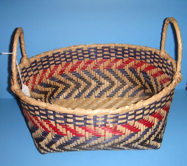 Choctaw Gathering Two Handle Basket, in tan, dark brown and red; 17 1/2" w., 8 1/2" d., 13" h. Choctaw Gathering Two Handle Basket, in tan, dark brown and red; 17 1/2" w., 8 1/2" d., 13" h.
