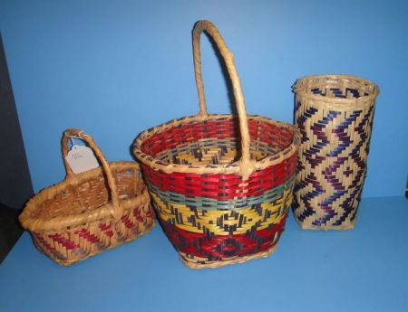 Three Various Shaped Choctaw Baskets, one oval basket in tan, maroon, medium brown (9" w., 8 1/2" h., 8" d.) one in blue, purple and tan (no handle 5" dia., 10" h.) one other (10" dia., 15" h. Three Various Shaped Choctaw Baskets, one oval basket in tan, maroon, medium brown (9" w., 8 1/2" h., 8" d.) one in blue, purple and tan (no handle 5" dia., 10" h.) one other (10" dia., 15" h.