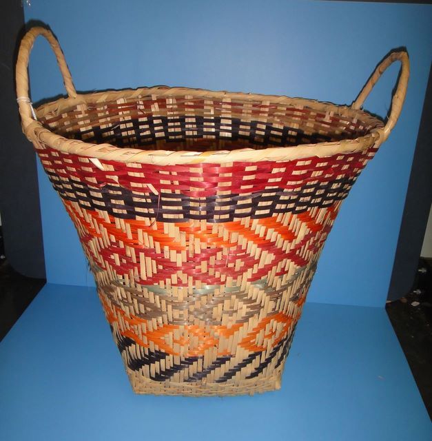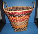 Large Two Handle Choctaw Gathering Basket in tan, orange, black, two shades of green and red; 17" dia., 21" h., 16 1/2" d. Large Two Handle Choctaw Gathering Basket in tan, orange, black, two shades of green and red; 17" dia., 21" h., 16 1/2" d.